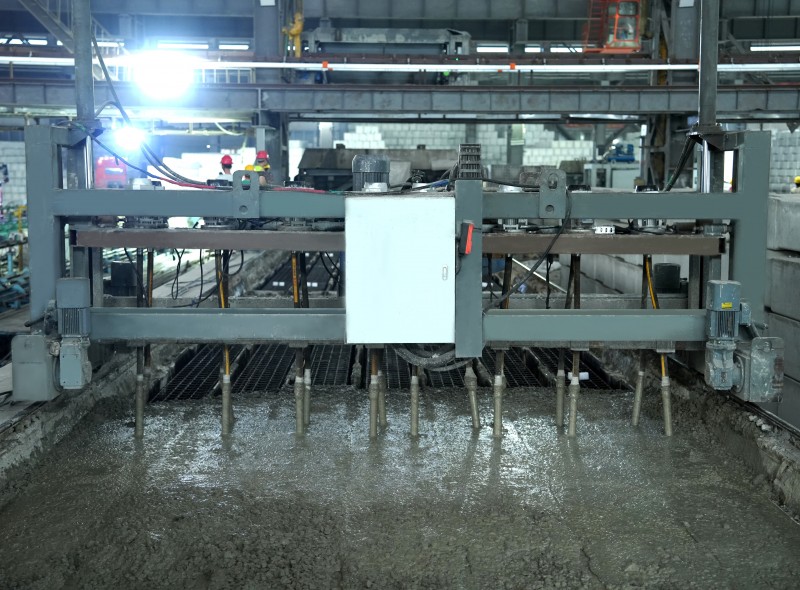 振動機可通過調節(jié)油缸伸縮長度控制中間架的整體升降,實現(xiàn)振動棒的升降,振動棒頭部的球面以及中間部分的軟管,可使振動棒自適應,在鋼筋籠的不同位置都能順利插下去。